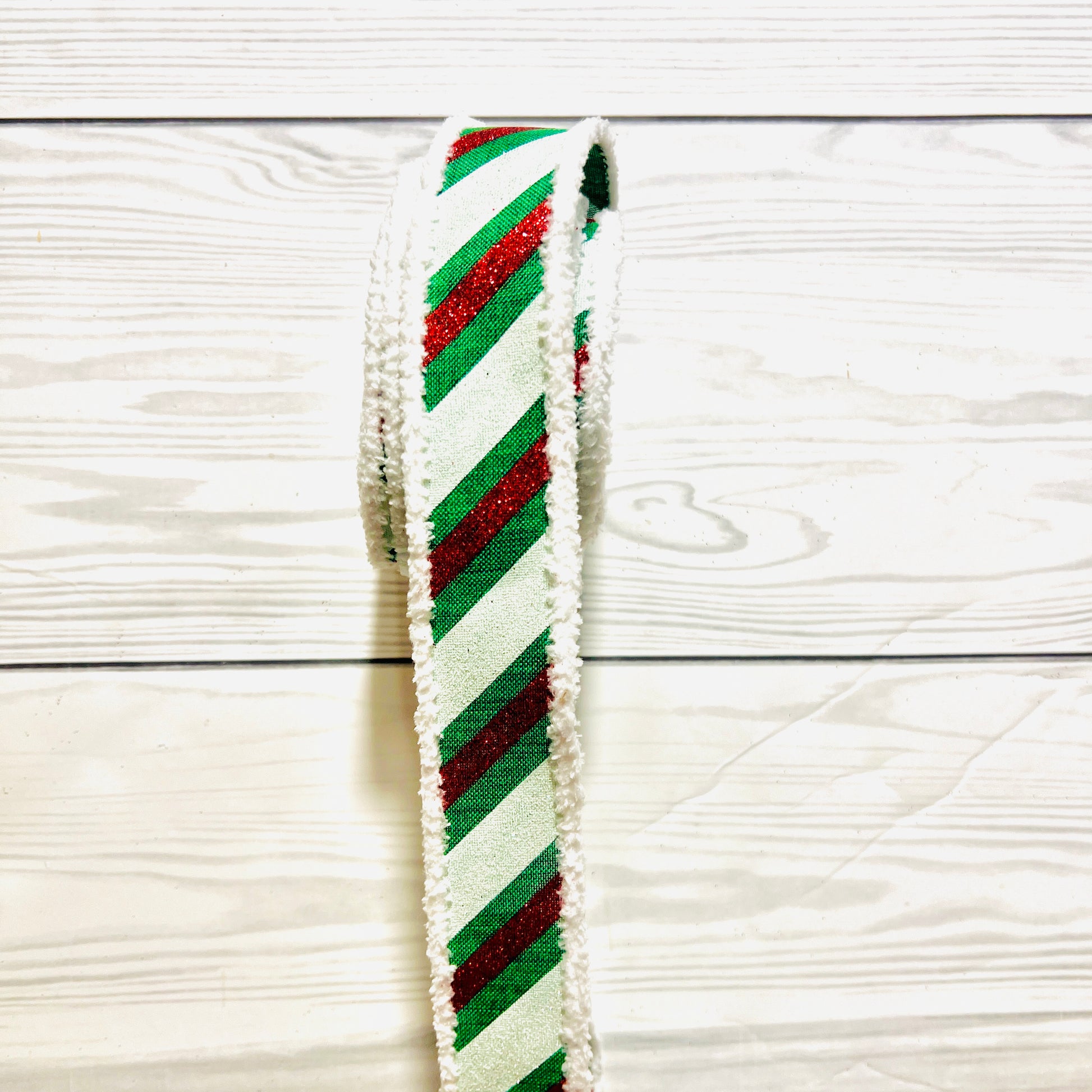 • 1½” Diagonal Stripe Ribbon with Snowdrift Edges (Red, White & Green)