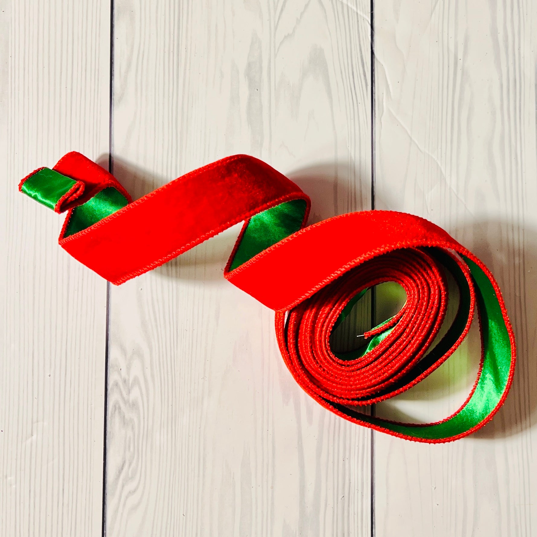 • 1½” Red Velvet Ribbon with Green Satin Back – rich and luxurious