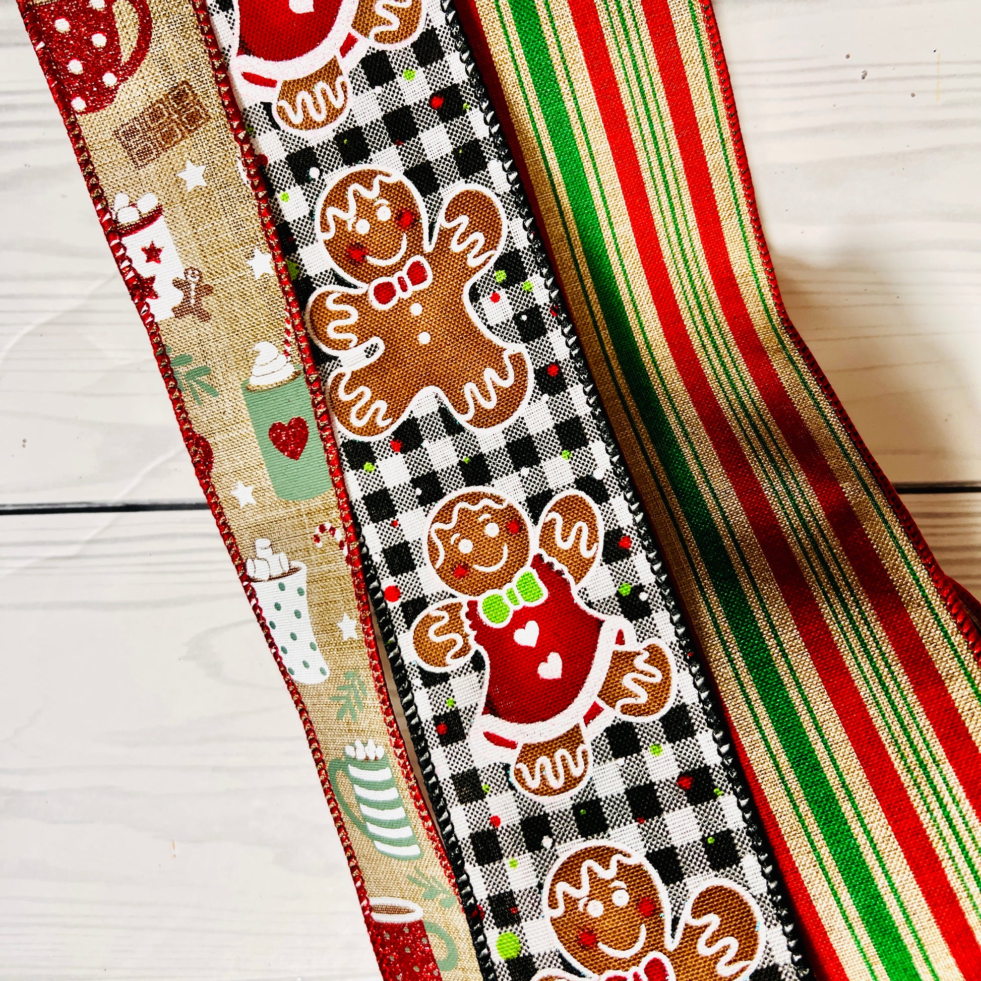• 2½” Buffalo Plaid Ribbon with Gingerbread Boy & Girl Print – adorable and festive